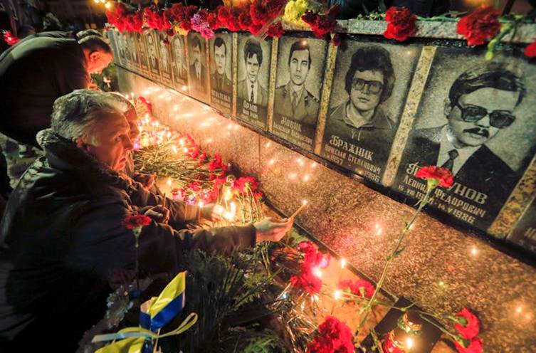 Ukrainians light candles at a memorial to the liquidators – the workers who gave their lives to contain the Chernobyl disaster. Sergey Dolzhenko/AAP